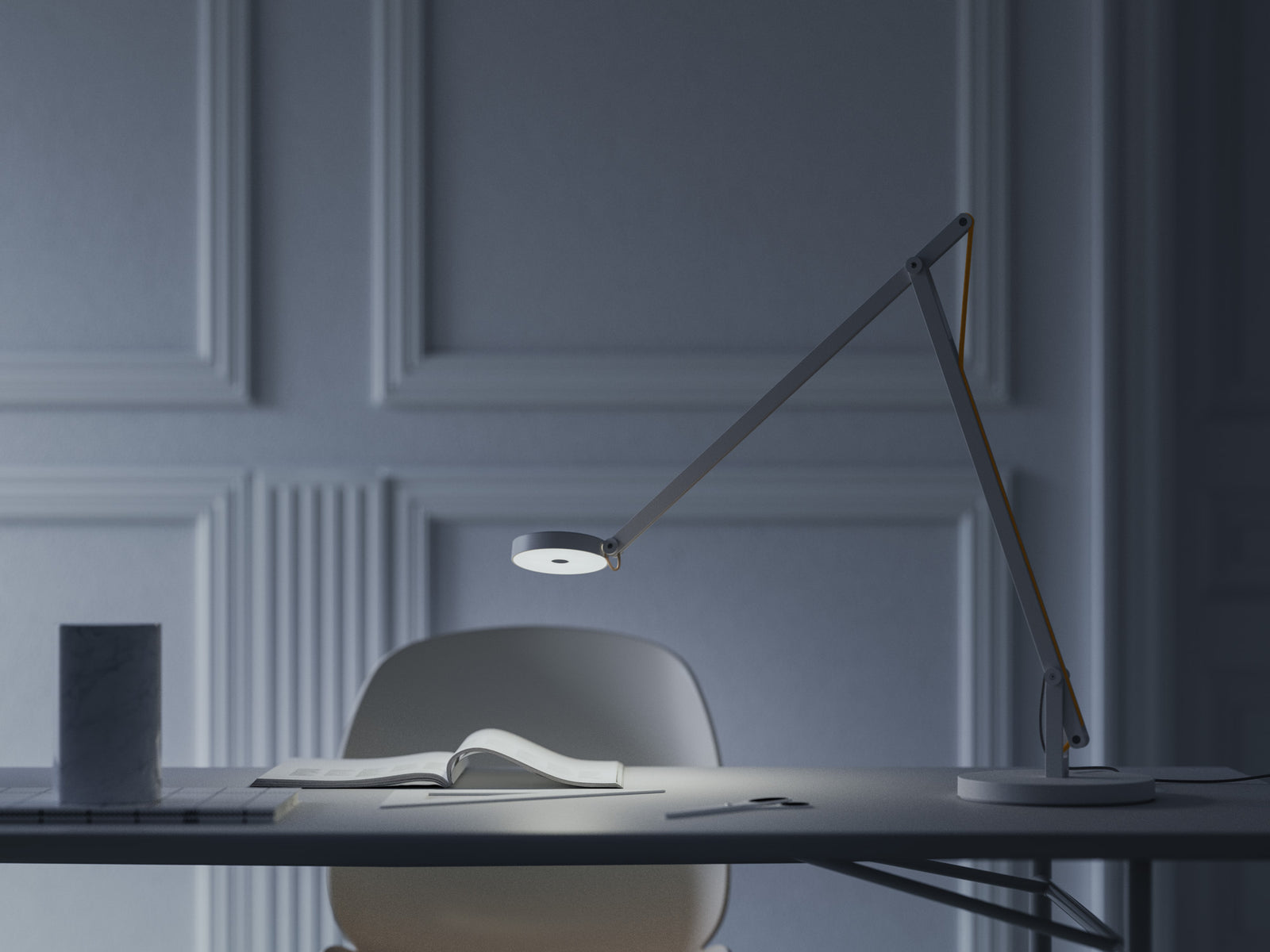The String T1 Table Lamp by Rotaliana realises modern design in a highly functional form. The adjustable head, made of moulded plastic, is easy to handle thanks to its ring shape. Two adjustable arms in extruded aluminium are balanced by an elastic cable, sheathed in synthetic-coloured fabric, and by an aluminium and cast-iron ballast base. A touch-sensitive tuneable-white switch within the lamp's head adjusts the LED light's luminosity and colour temperature (2500K to 4000K). Available in various contemporary finishes with three cable colour options. Made in Italy.