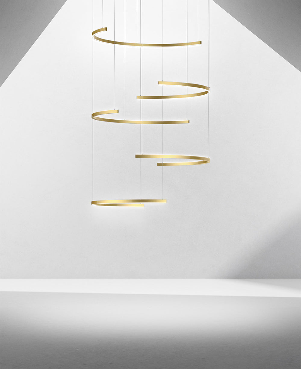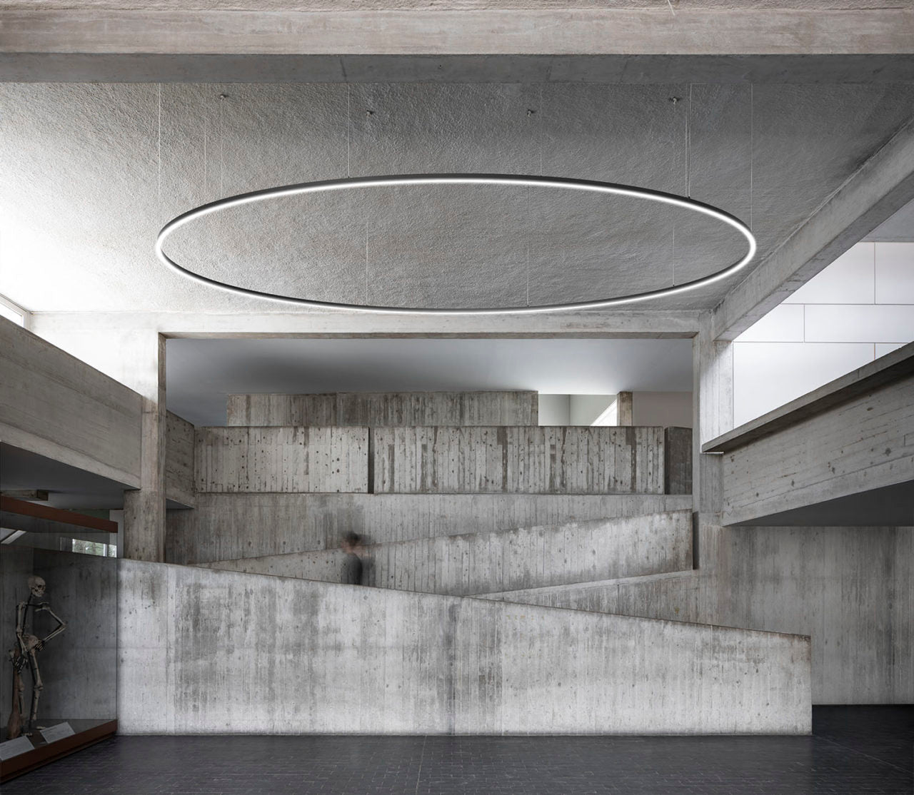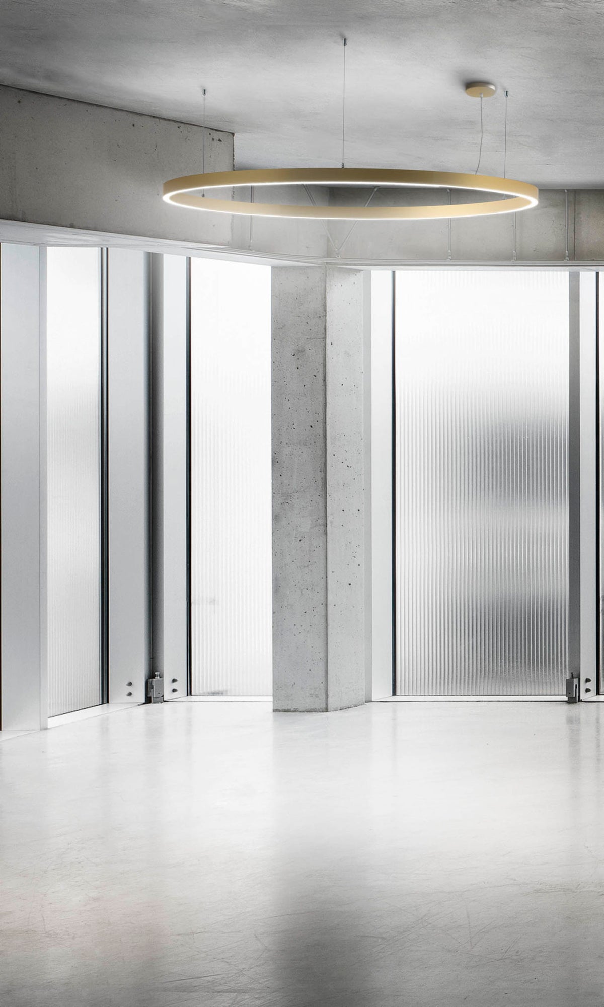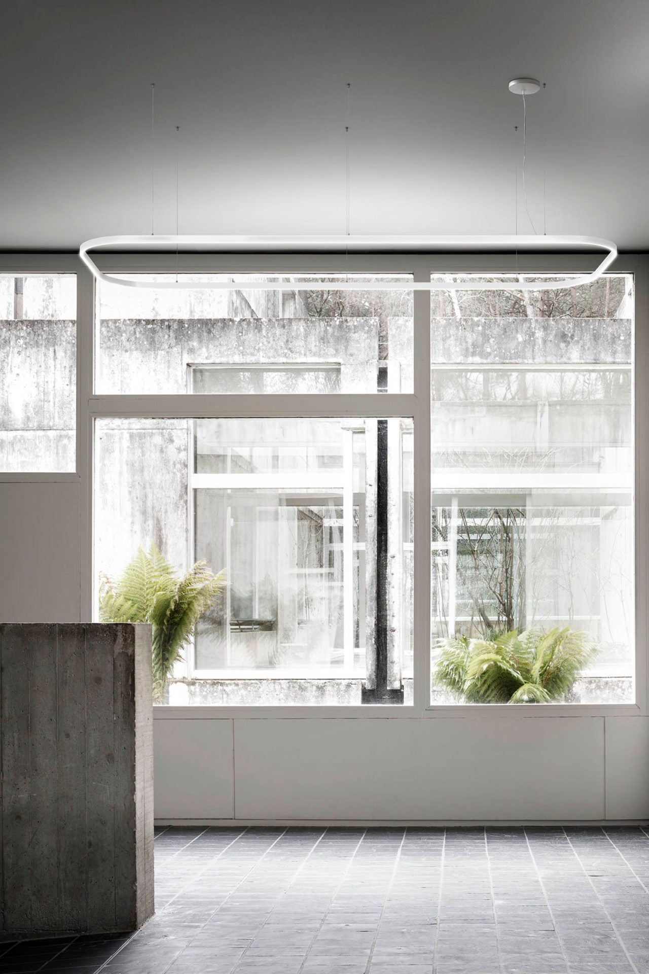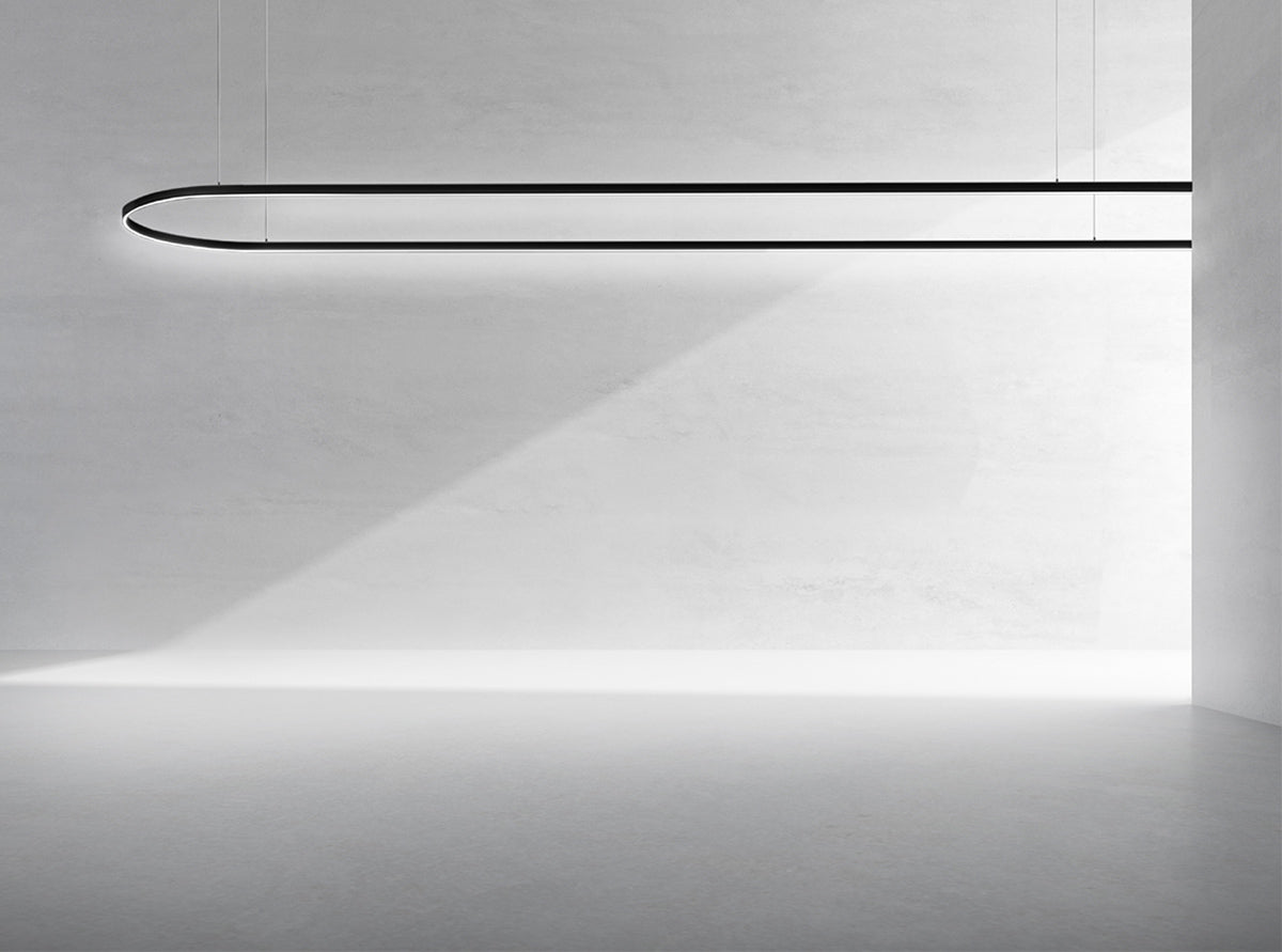 The ZIRKOL suspension lamp family evolves from the classic round luminaire into various shapes. It balances design and lighting, making it essential in architecture. Each model comes in different sizes and finishes, using a unified aluminum profile for a consistent aesthetic. Suitable for residential and public spaces, ZIRKOL offers single downlight or double uplight/downlight emission for optimal visual comfort. The new ZIRKOL ACOUSTIC pendant lamp combines lighting with acoustics, featuring a sound-absorbing circular panel covered in grey recycled polyester fabric for a comfortable atmosphere.
