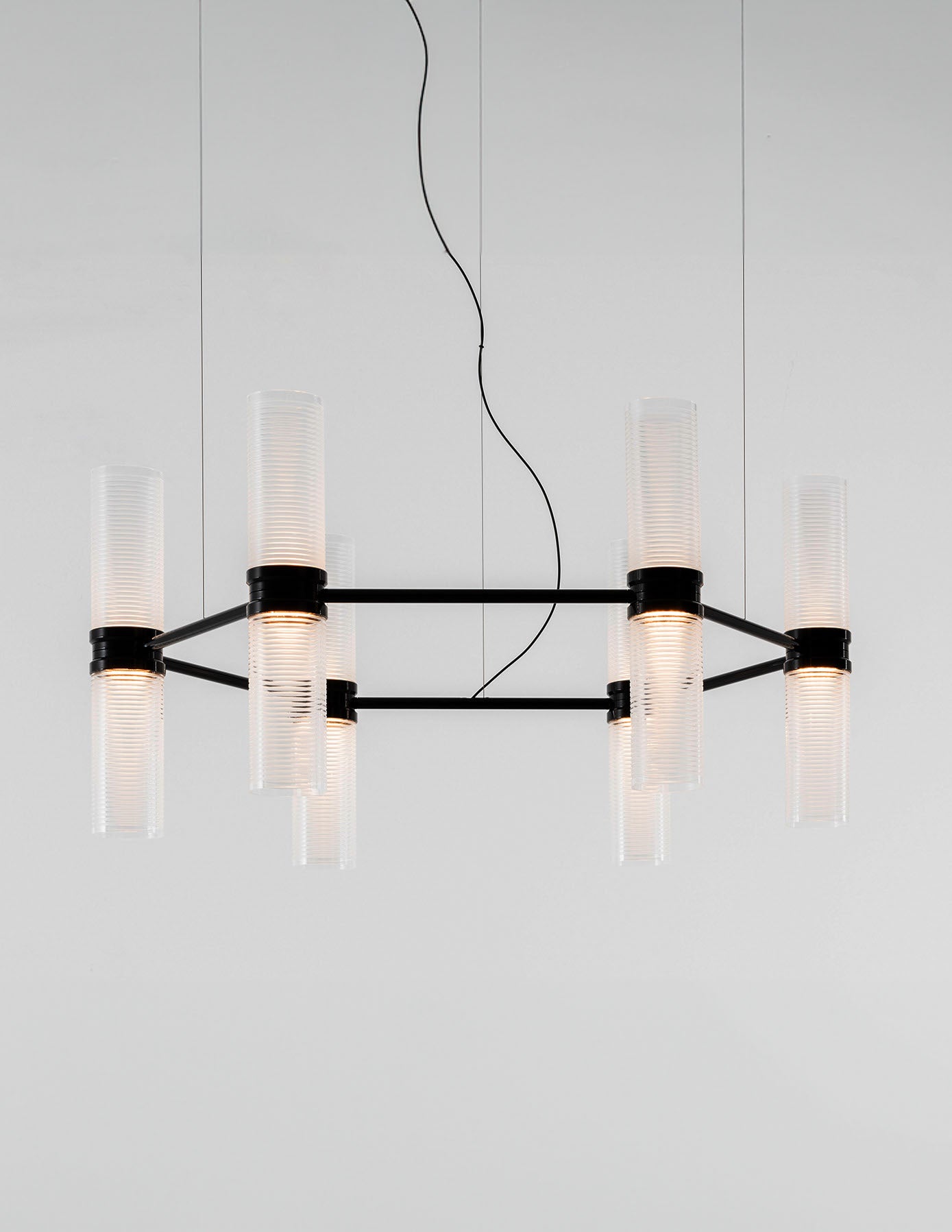 The Artemide Zephyr is a minimalist and elegant pendant that reinterprets the traditional chandelier with contemporary sophistication. Designed by Carlo Colombo, Zephyr features a modular frame system that enables infinite custom layouts to suit the specific needs of each project. The distinctive modular element comprises a double cylindrical diffuser with a central body that encloses the integrated LED light sources. Through two innovative rings that rotate on the same axis, the system defines the position of neighbouring lighting bodies by precisely positioning the connecting structural elements. The hand-blown glass diffuser creates a horizontal texture for glare-free diffusion. This hexagonal suspension features 55W of power delivering 4093lm of warm 3000K light. Available in black or bronze finish with PUSH/DALI or APP controlled dimming. Made in Italy.
