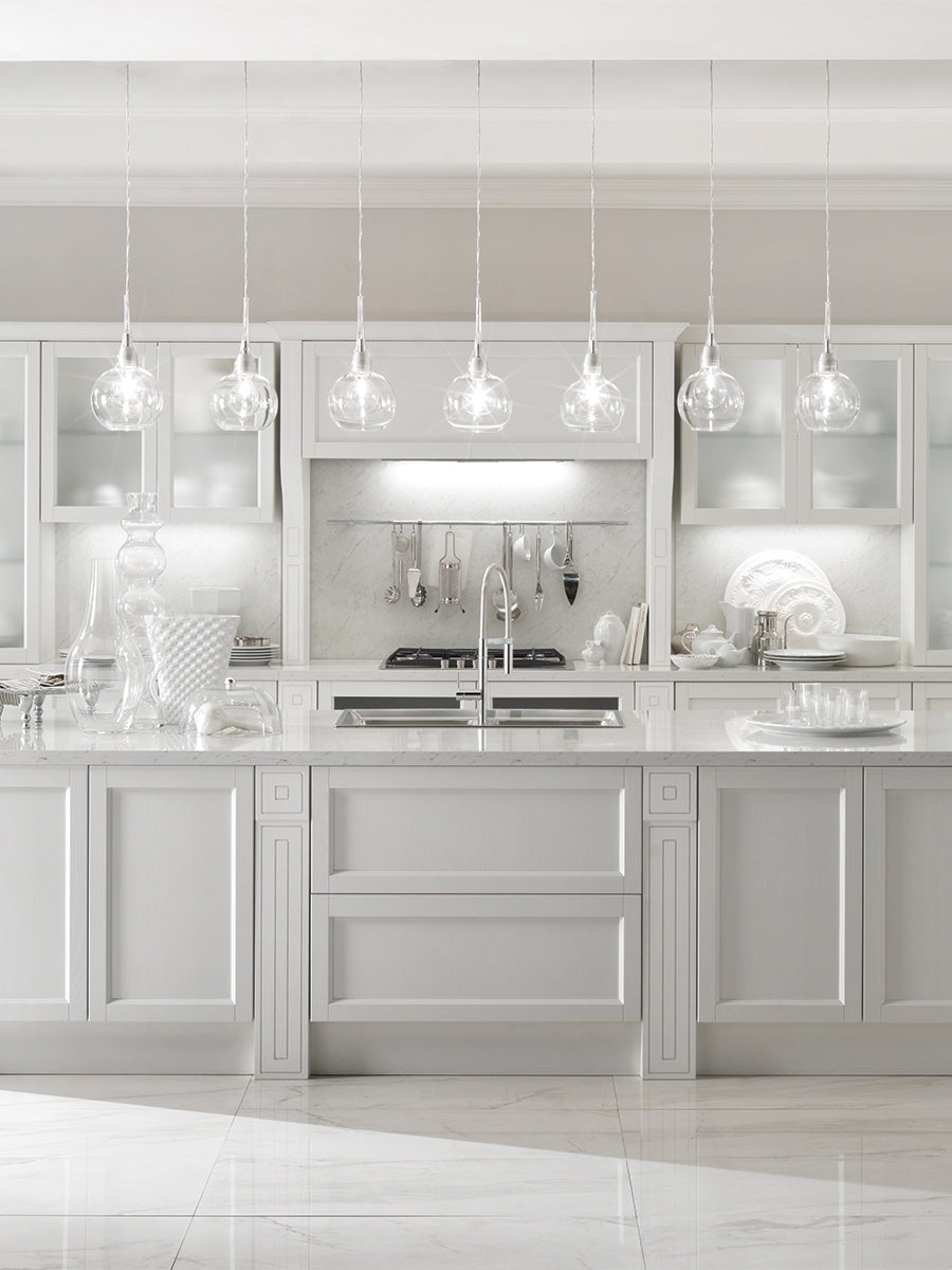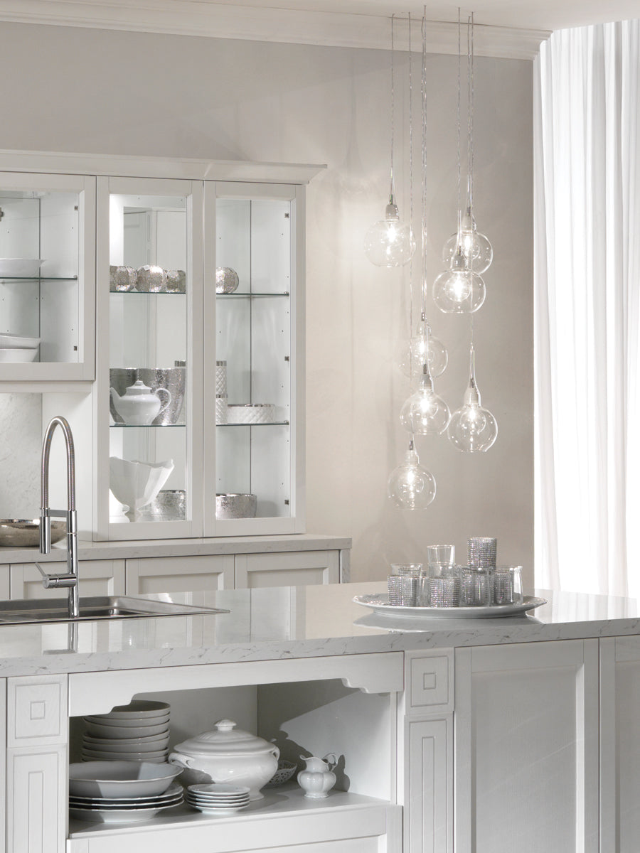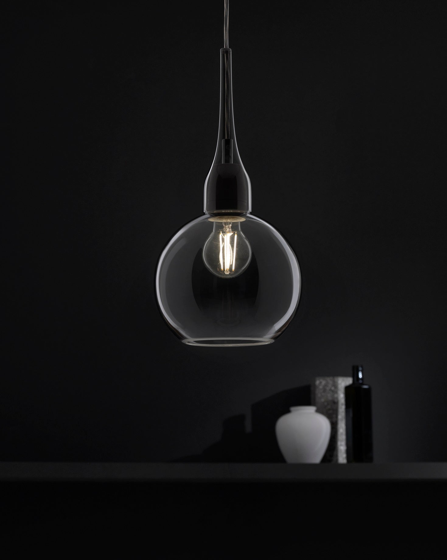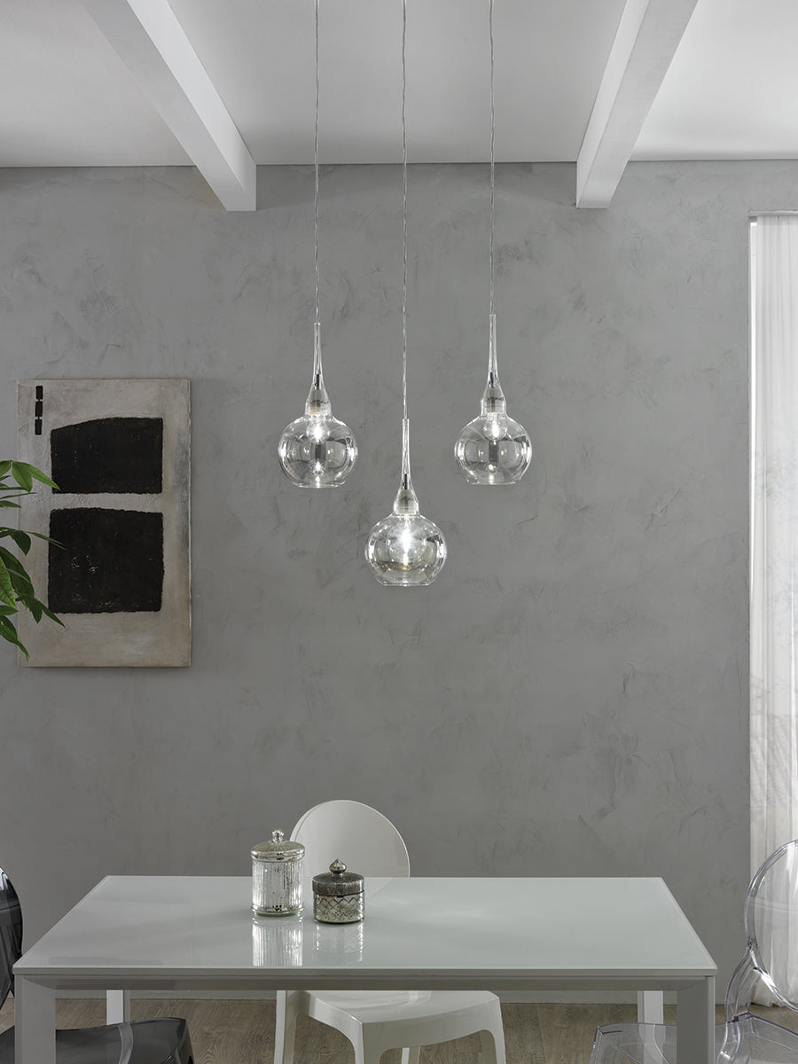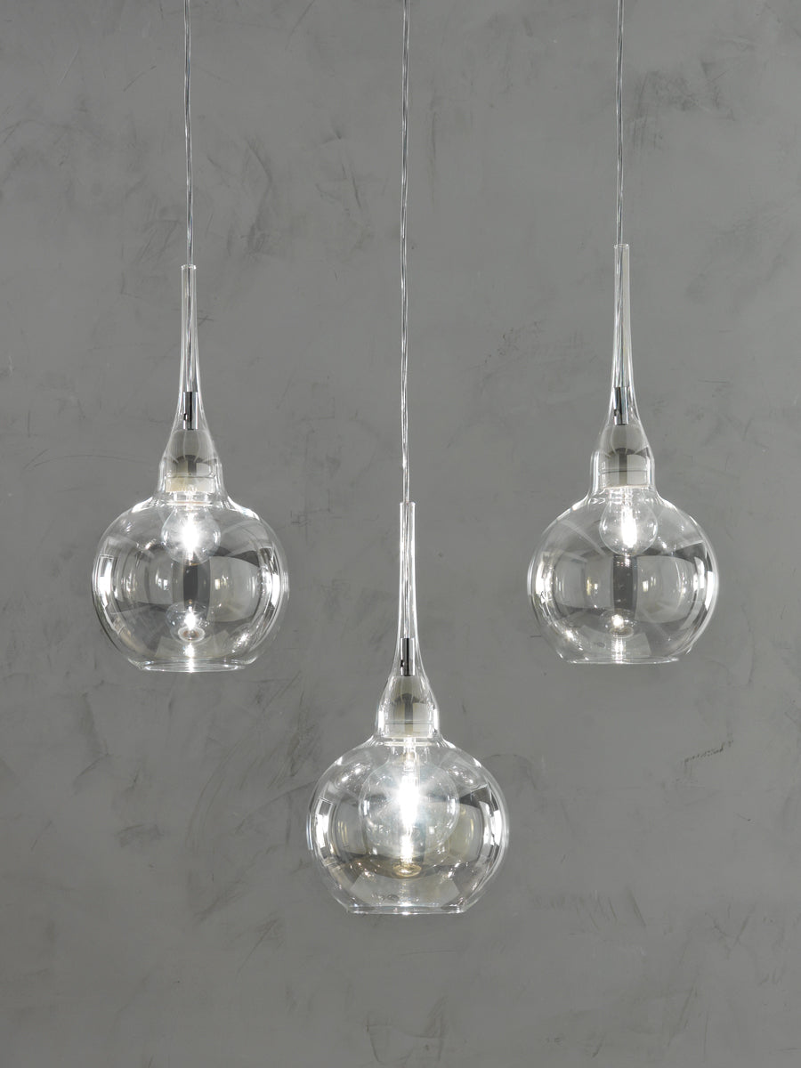 300g is an Italian made mouth blown glass pendant. The curvature of the light's design instantly softens a space and is well suited to dining rooms and kitchens. Available in transparent glass with white detail.