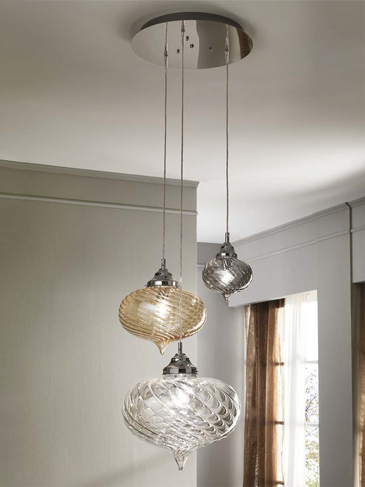 Arabesque is a collection of mouth blown glass pendant lights from Cangini & Tucci. The Arabesque 3 light pendant allows three individual Arabesque pendants to be hung from a central base, creating a feature lighting piece in a space. The 3L pendant base is compatible with any combination of three single pendants, allowing the user to customise the look of the piece. Single pendants are available in 3 sizes, a variety of finishes with smooth or striped surface.