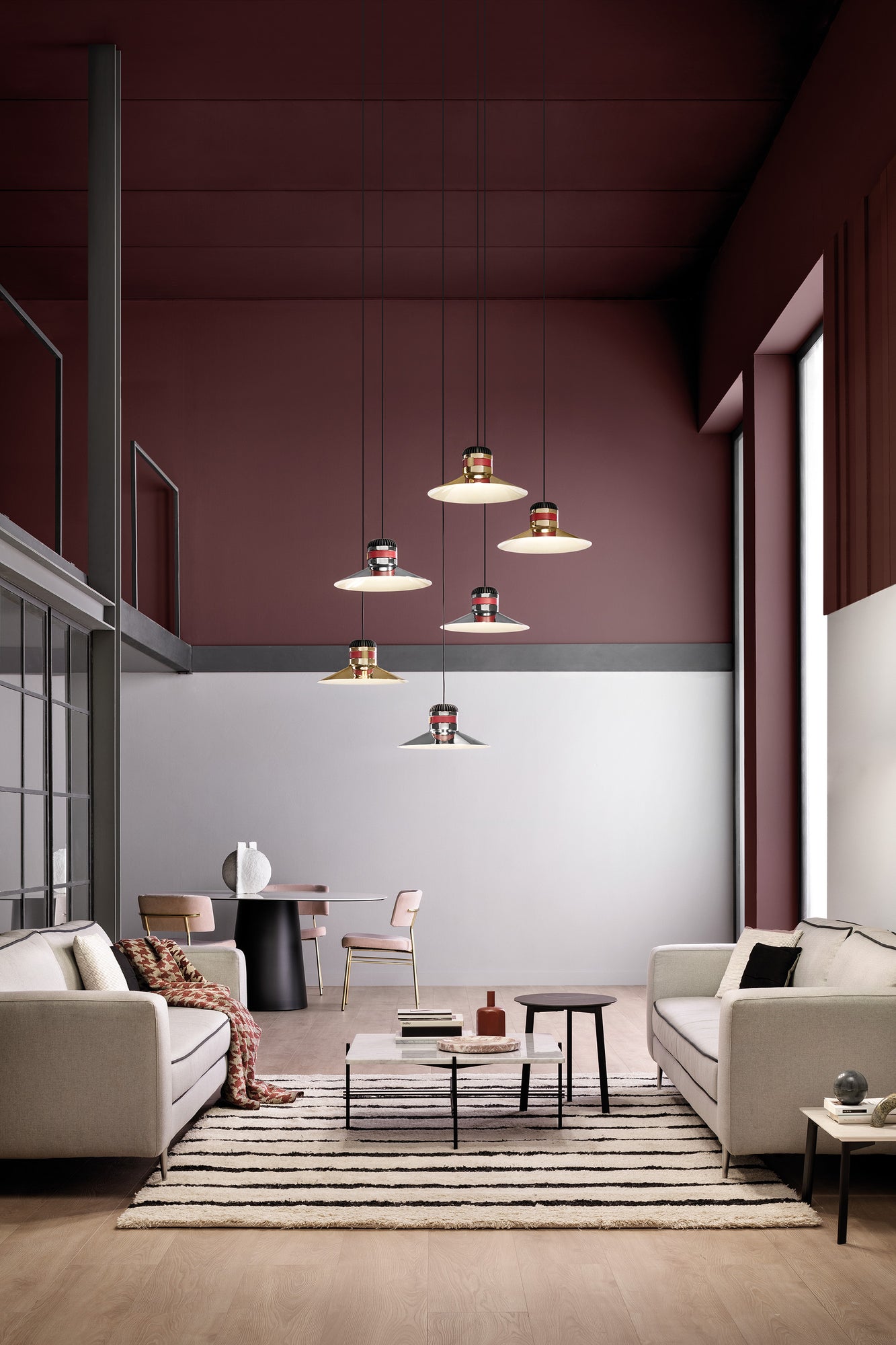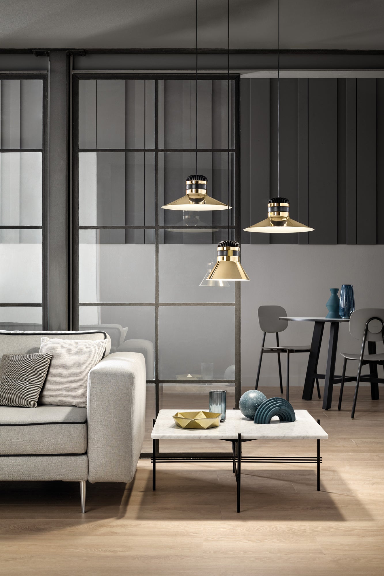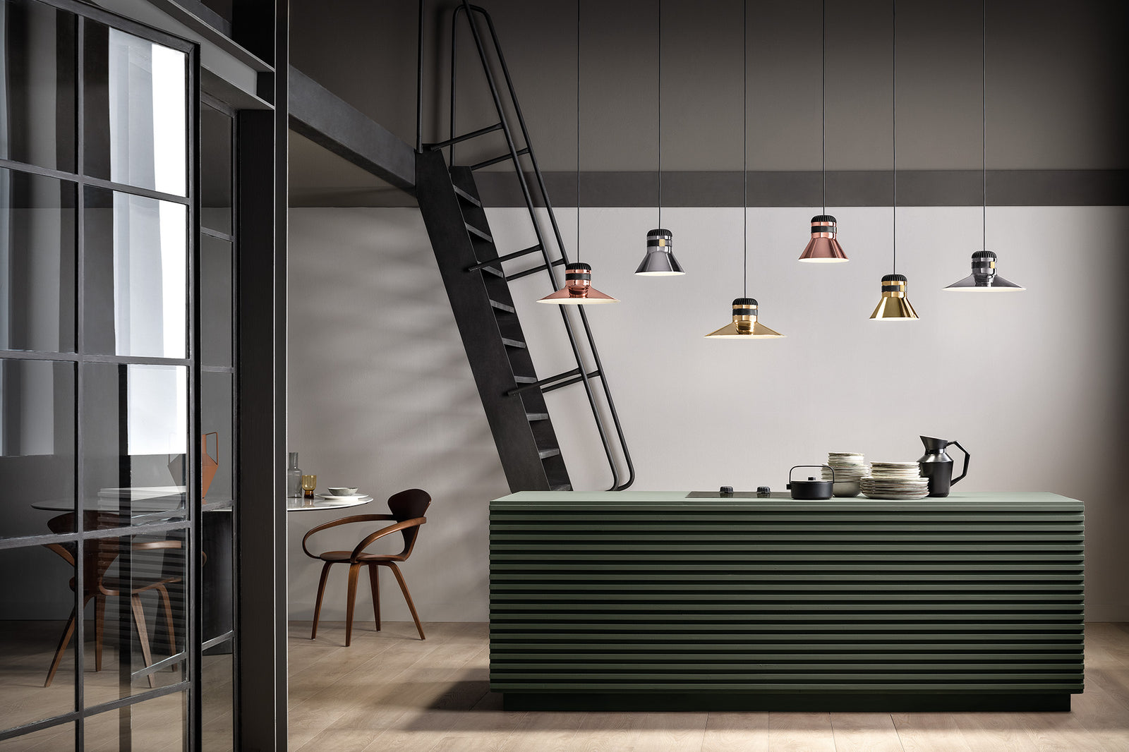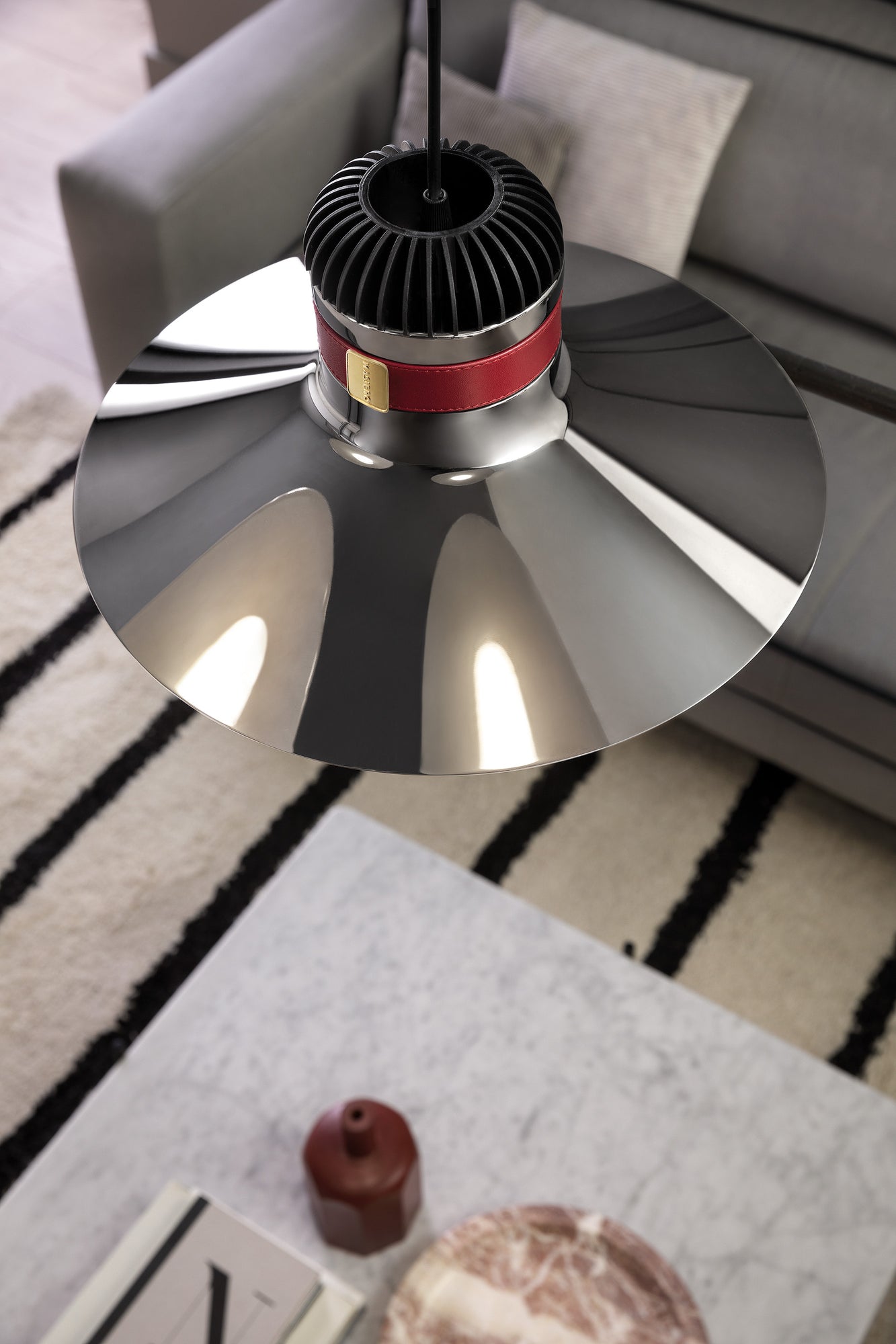 Cordea pendant light was born out of the desire to reinterpret the classic industrial lamp with an aluminium lamellar head, from an aesthetic and material perspective. The galvanised metal structure is decorated with a leather strap for a unique contemporary look. A white frosted glass diffuser and inbuilt LED source produces an ample and widespread illumination. Design by Favaretto & Partners.