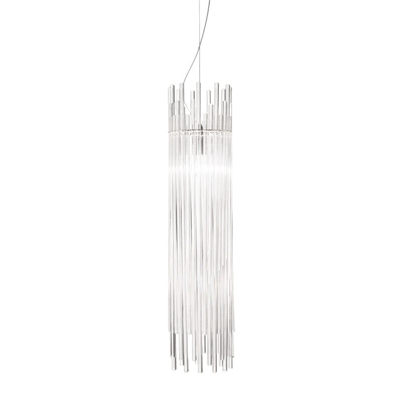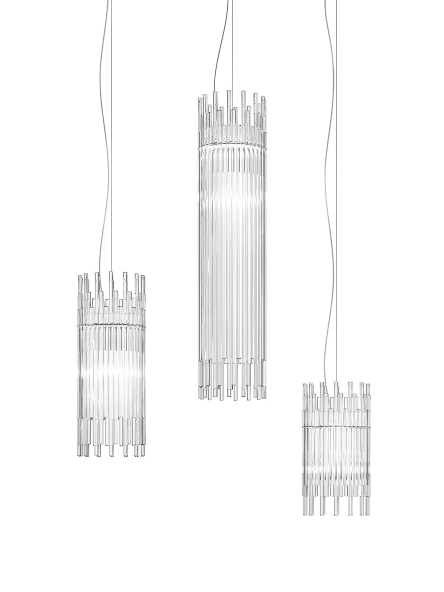 Diadema is based on the single element of the rod in pure glass. Combining reeds of different sizes, the light reflects and transmits a feeling of movement. The metal frame allows numerous variations and plenty of room for customized versions. The Diadema single pendant is available in a wide range of sizes. Design by Romani Saccani Architetti Associati for Vistosi. Made in Italy.