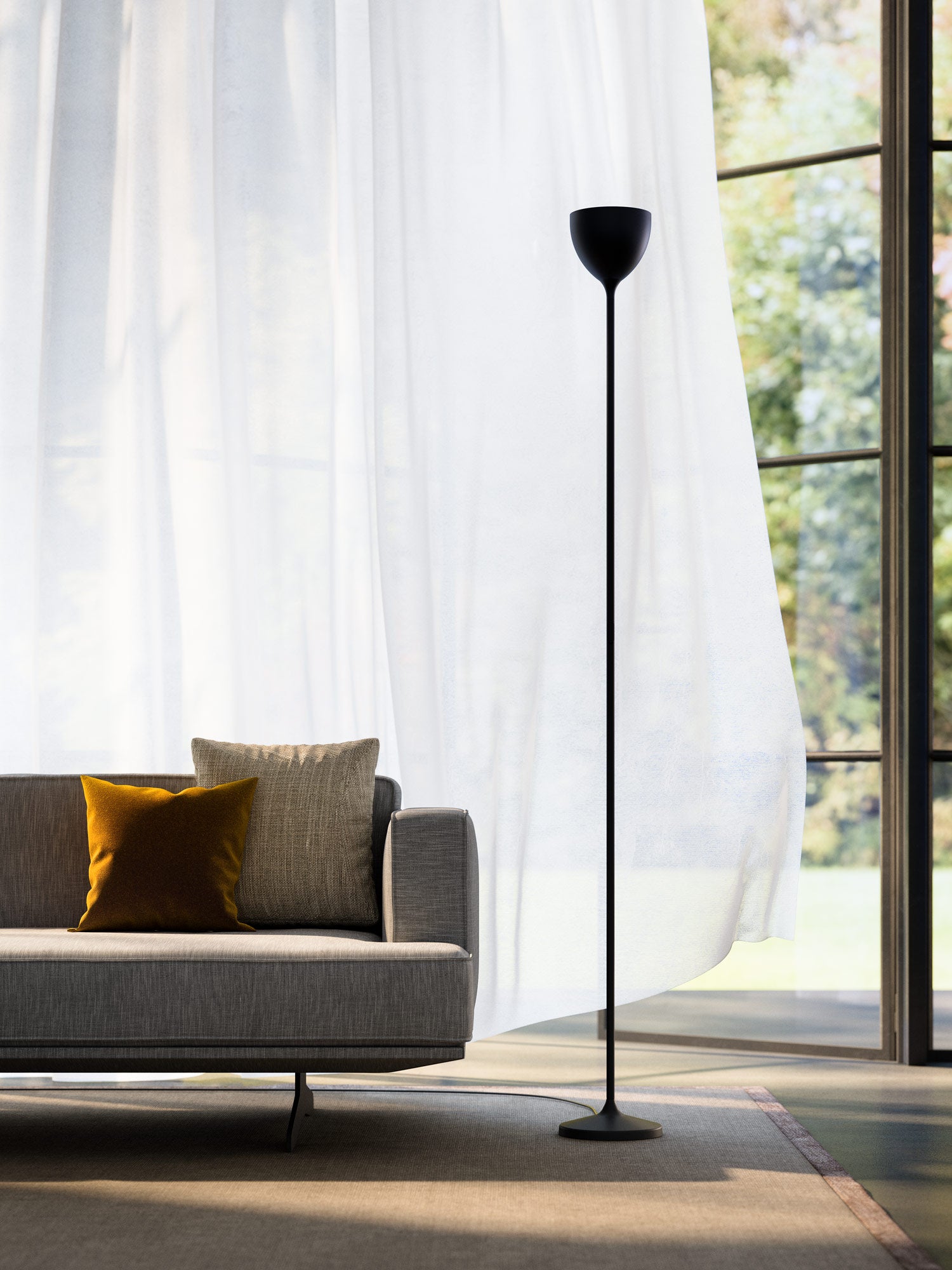 Drink is a line of suspended and floor lamps featuring a simple and iconic design reminiscent of the shape of a chalice filled with light. It's elegant yet minimalist aesthetic fits in with most modern interiors, providing a discreet accent within a space. Drink is available in a wide range of shiny lacquers in the classical tones of colour or with opaque and glazed finishes that evoke the world of metals. Features push dimmer on cable.