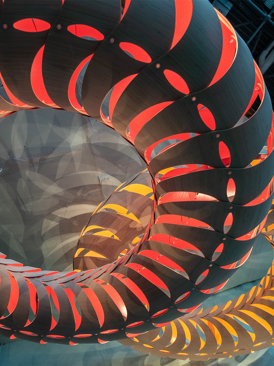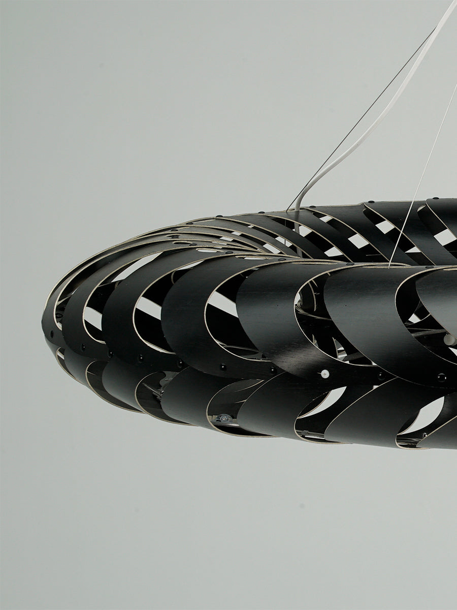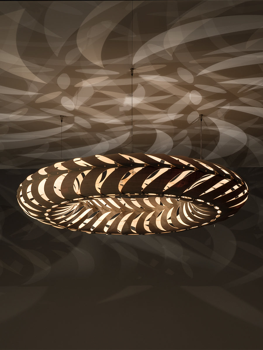 Maru is the newest concept luminaire from David Trubridge. Made from 60 identical components that clip together to create an elliptical form. The name Maru is found in both New Zealand Maori and Japanese languages, with references to the cycle of life. Maru casts complex patterns on neighboring surfaces, creating a unique ambiance.