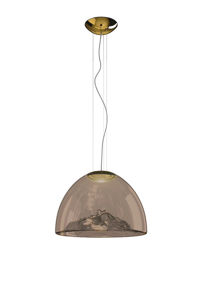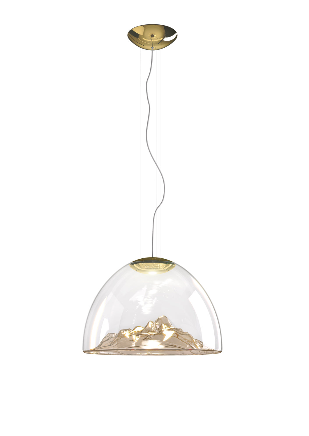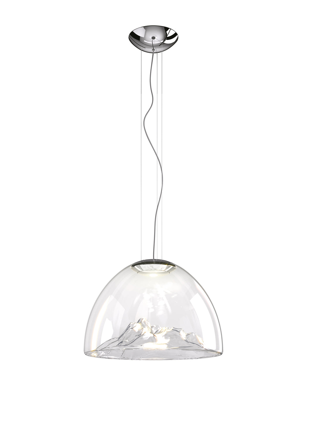 The Mountain View Pendant Light is an enchanting fixture that will become the focal point of any room. Made of transparent blown glass masterfully hand-crafted. The shade consists of two parts: a simple dome encompassing dome with a majestic mountainesque structure located within, evoking visions of mountain ranges. Available in a variety of finishes, the mountain range glistens from all angles just like a real mountain would in the sun via a dedicated LED light source located at the top of the shade. This beautiful, decorative pendant light adds an ethereal effect that is perfect within both residential and commercial spaces. Design by Dima Loginoff for Axolight.
