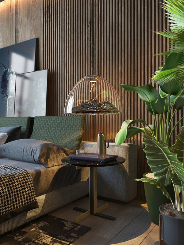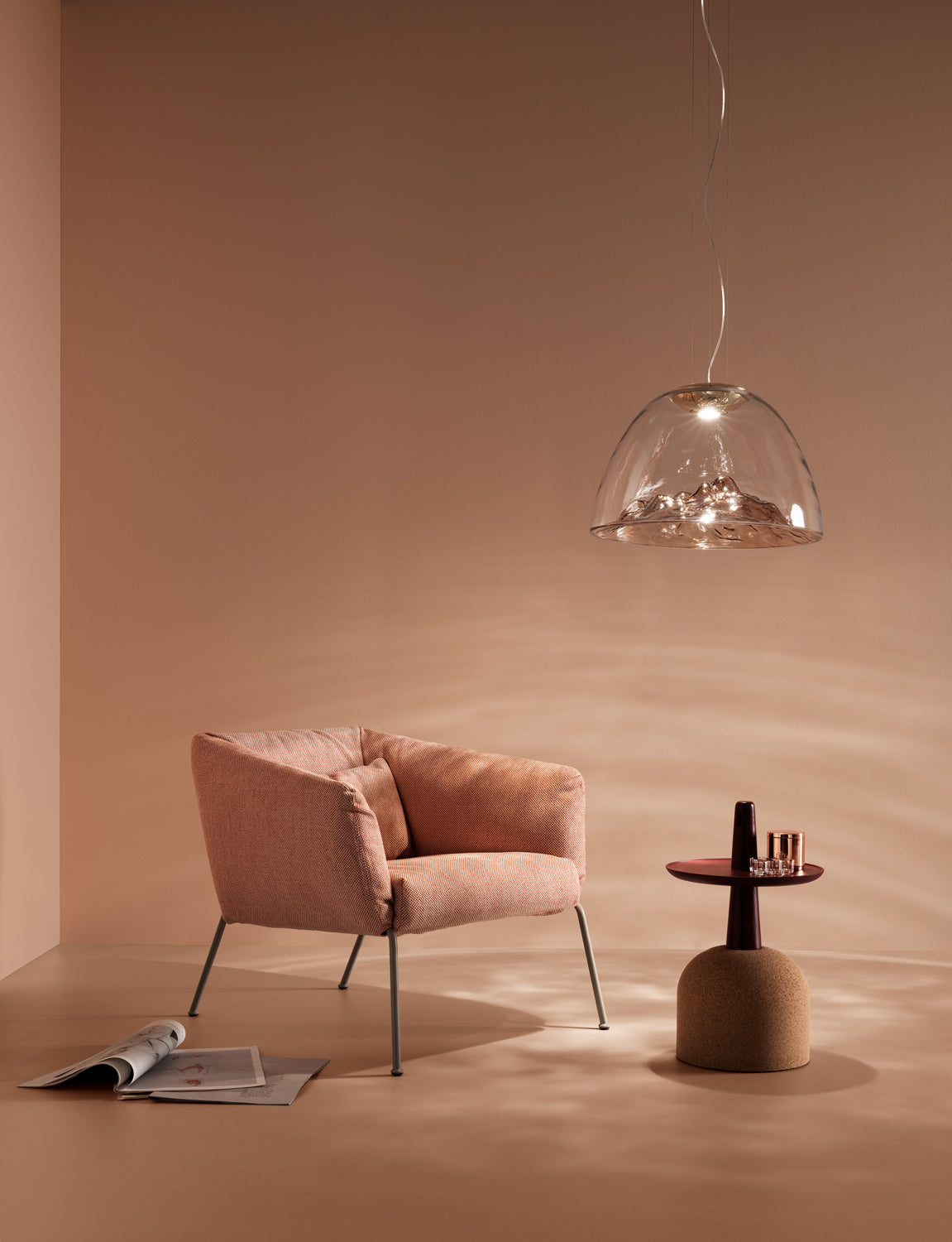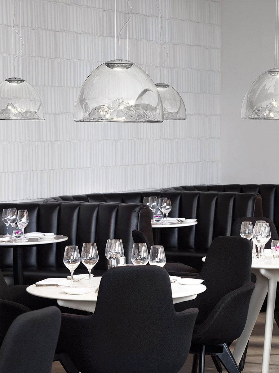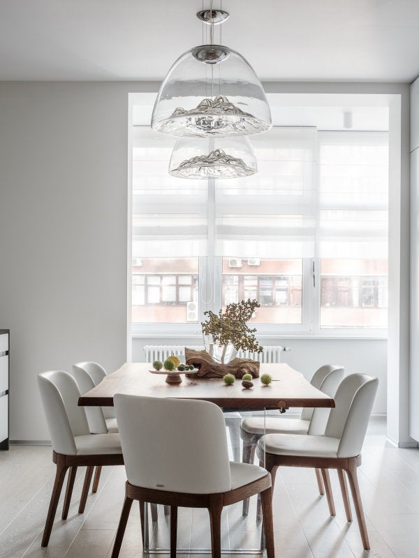 The Mountain View Pendant Light is an enchanting fixture that will become the focal point of any room. Made of transparent blown glass masterfully hand-crafted. The shade consists of two parts: a simple dome encompassing dome with a majestic mountainesque structure located within, evoking visions of mountain ranges. Available in a variety of finishes, the mountain range glistens from all angles just like a real mountain would in the sun via a dedicated LED light source located at the top of the shade. This beautiful, decorative pendant light adds an ethereal effect that is perfect within both residential and commercial spaces. Design by Dima Loginoff for Axolight.