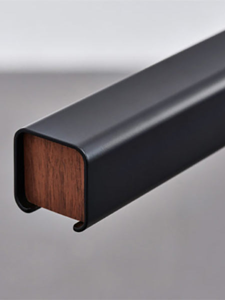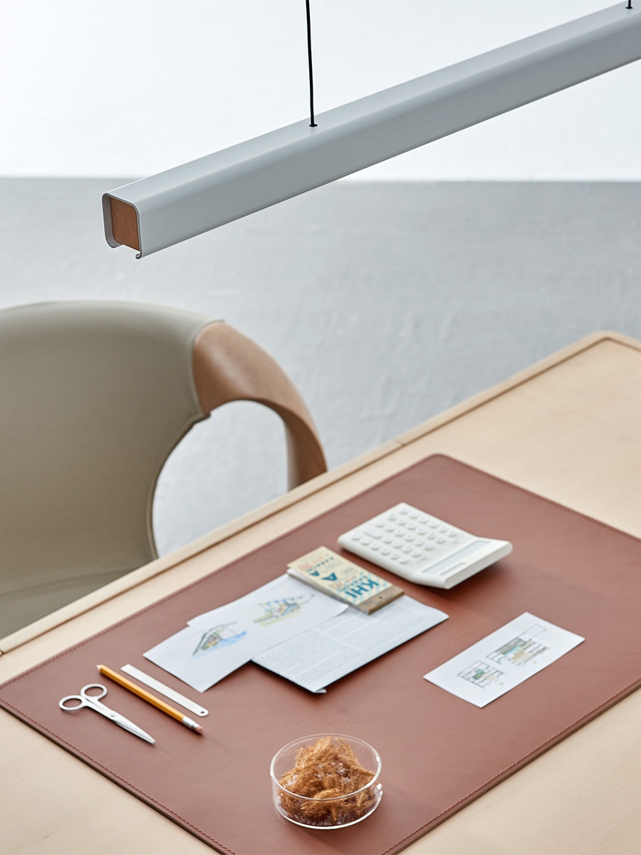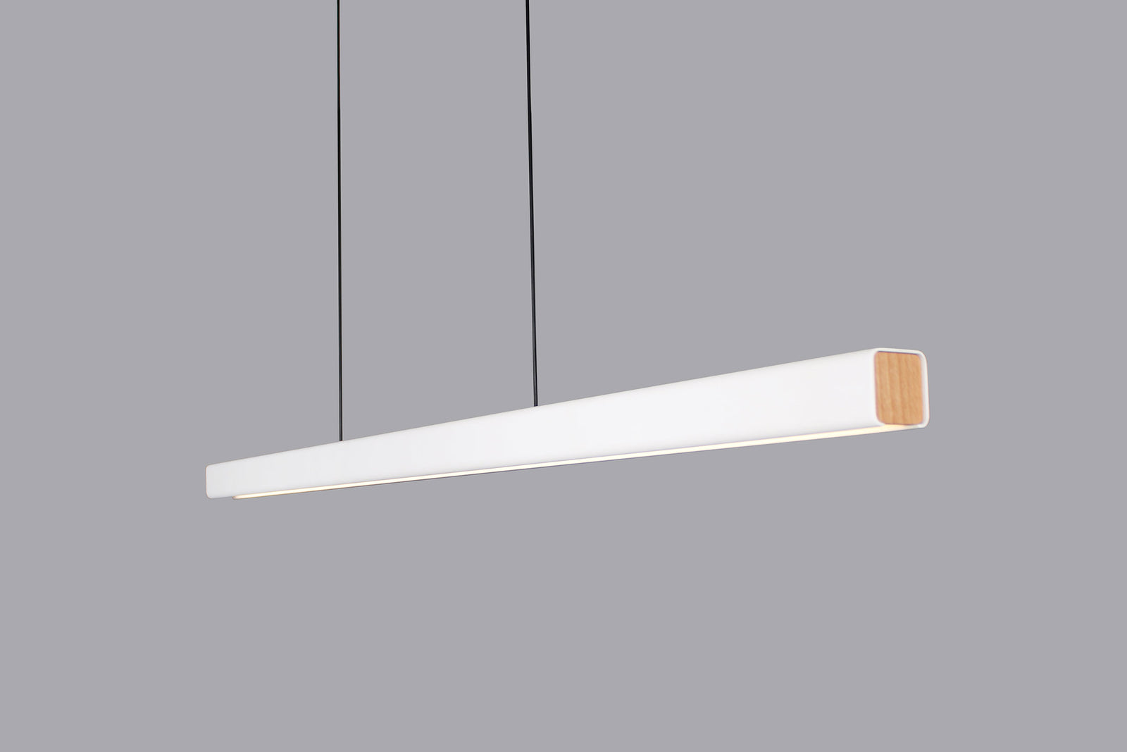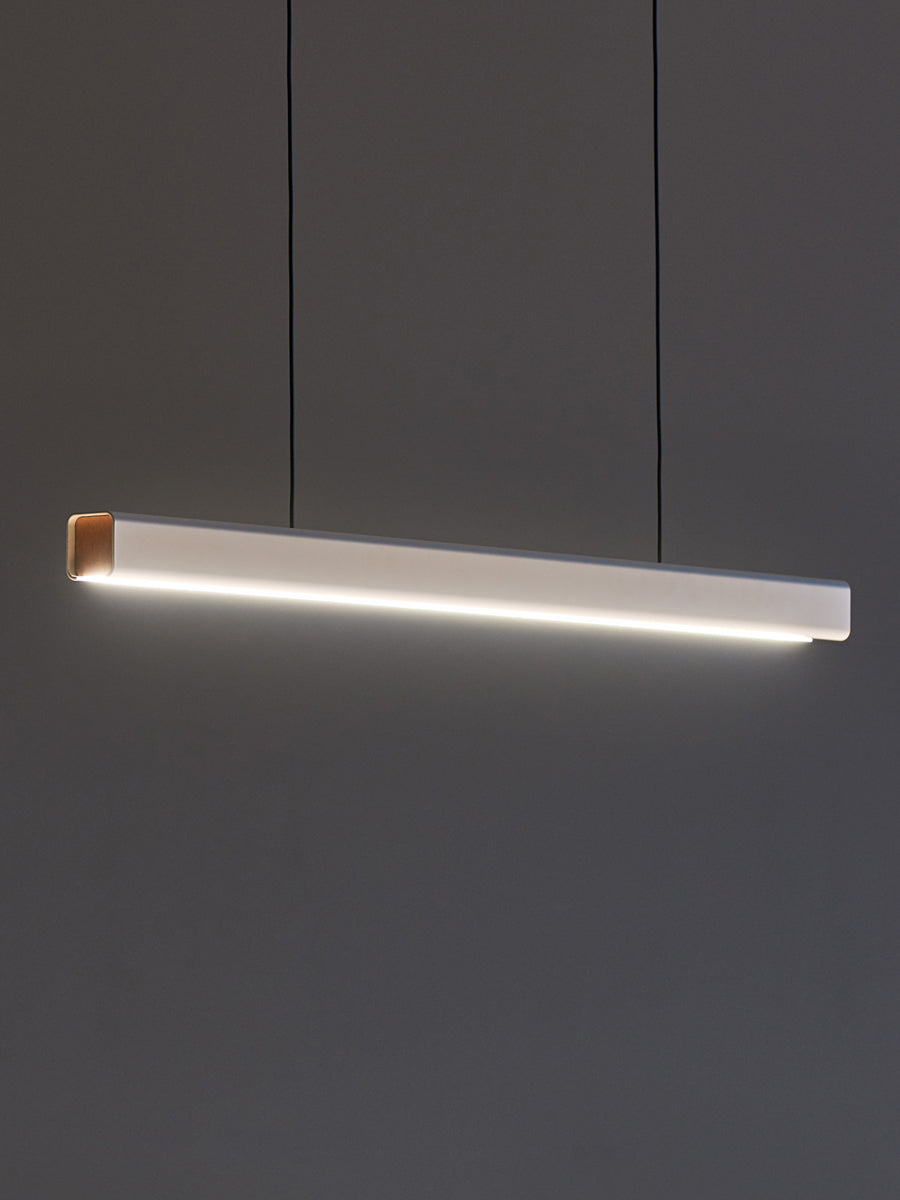 The MUMU Pendant combines a linear metal body with natural wooden accents for clean contemporary aesthetic. MUMU minimal aesthetic is well suited for modern spaces. Available in two sizes and two finishes: matt white with beech end-caps or matt black with walnut end-caps.