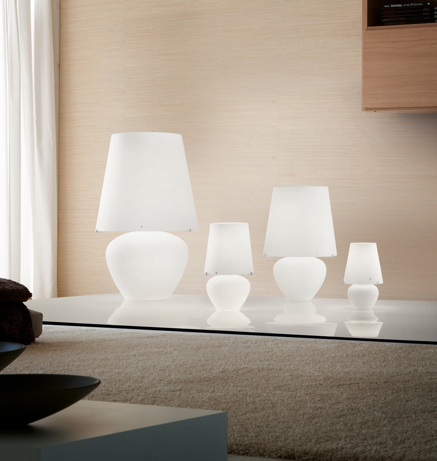 The Naxos is a collection of mouth-blown Murano glass Table Lamps with a subtle angled cone design. Both the shade and base illuminate creating a stunning lighting effect while the white satin-finish glass producing a soft diffused light. Available in four different sizes.