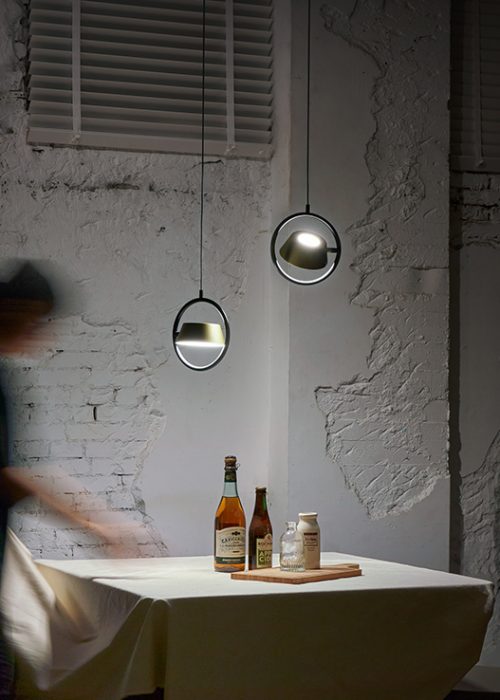 The OLO pendant by Seed Design is unique in that the shade is also the light source. The innovative design embeds an LED within the interior of the rotatable shade, creating an "invisible light source" effect. This also ensures that the light emitting surfaces are kept out of line-of-sight, reducing glare to a minimum. Available in a variety of finish options.