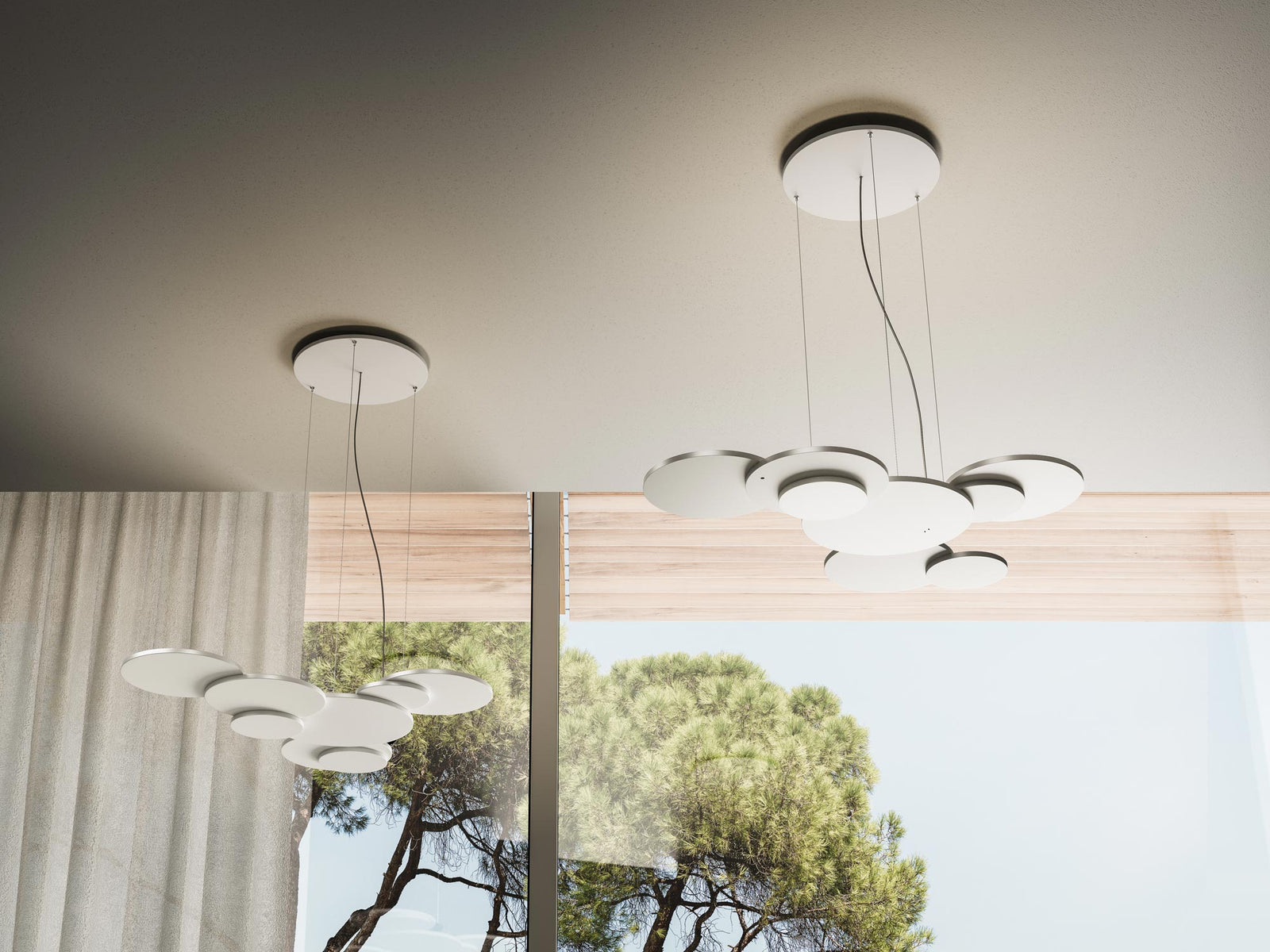 Overlap pendant takes it's name from the effect produced by it's overlapping of circular elements. Made entirely of aluminum and medium-density customization light panels. The central disk supports an LED source and the external disks arranged on different levels, producing an unobtrusive yet dramatic geometry. High output 34W 4000lm LED source with phase dimming. Available in matt white finish in 2700K or 3000K colour temperature.