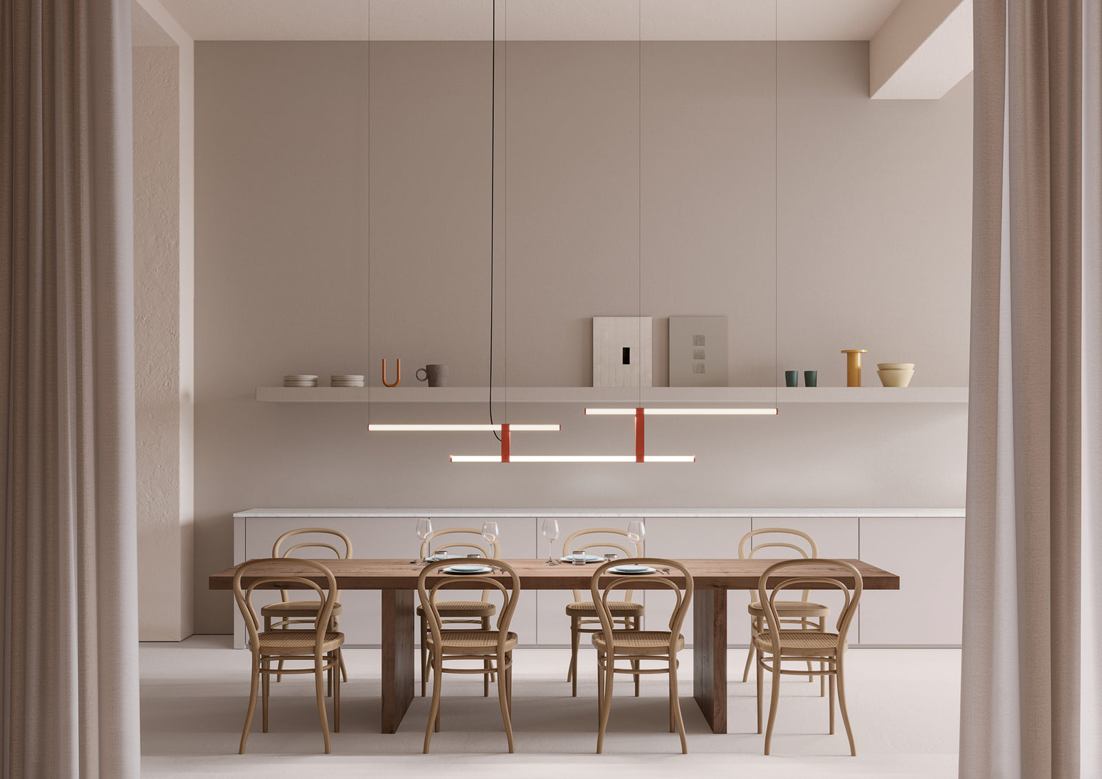 Paralela is a modular lighting system created by Nahtrang Studio from Spain. The aim was to turn light into a tangible decorative element. This led to the design of borosilicate glass cylinders connected by Nylon PA12 connectors. These cylinders use gravity to stay in place and create a neat arrangement that interacts visually with light, forming a beautiful display. Paralela is a versatile product line available in pendant (both horizontal and vertical), table lamp, floor lamp, and sconce versions. It comes in various sizes and five colors, offering a range of options for different spaces.