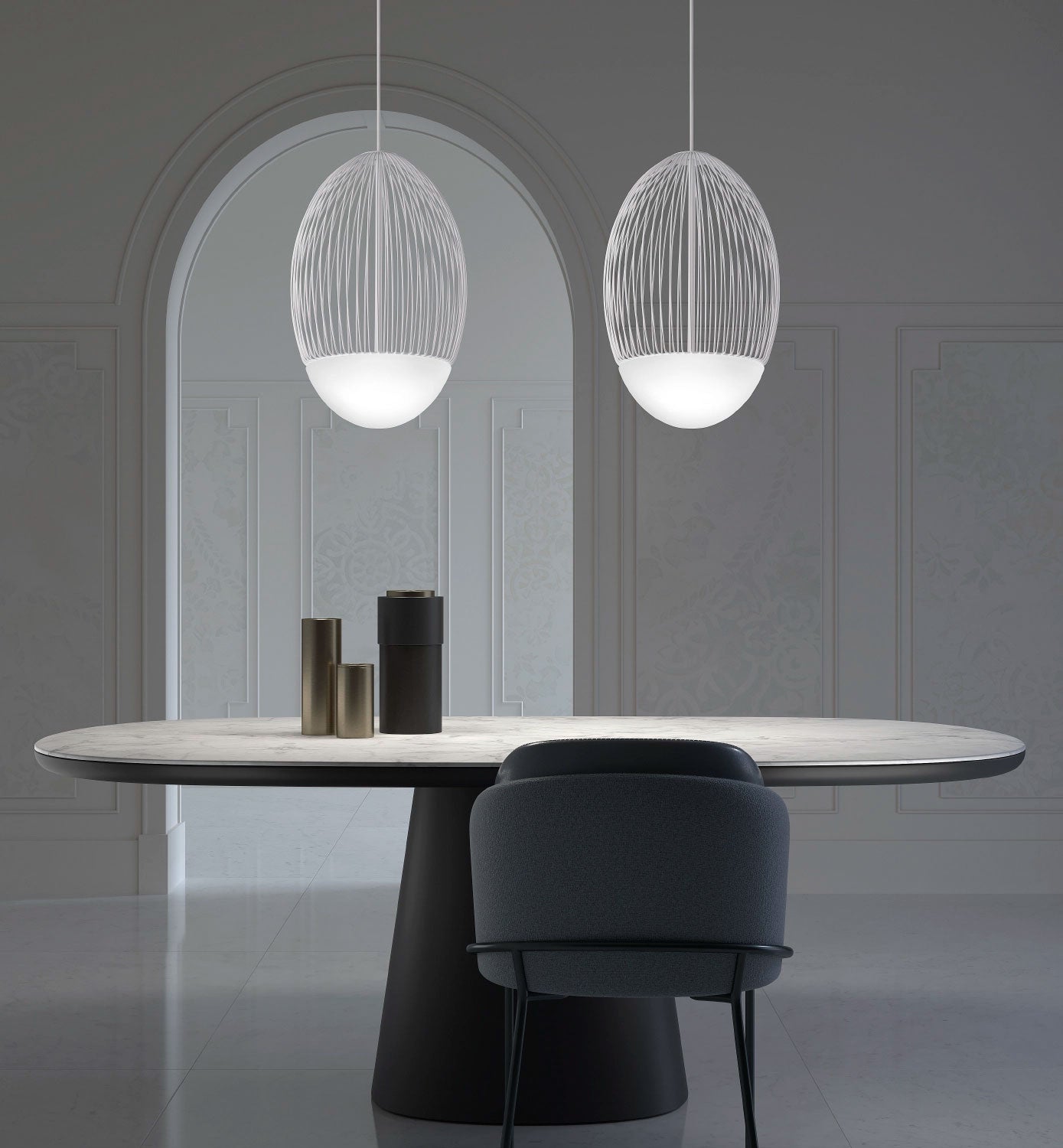 Riketta, the new hanging lamp by Oriano Favaretto for Vistosi, embodies a modern take on the classic egg shape. Blending white opaline glass at the base with 2.7 mm diameter metal rods at the top, Riketta's concealed LED source within the white glass diffuser creates subtle illumination. Available solely as a pendant, the lamp can be used individually, in pairs, or groups, offering diverse lighting effects through adjustable suspensions. Available in white finish in two size options.