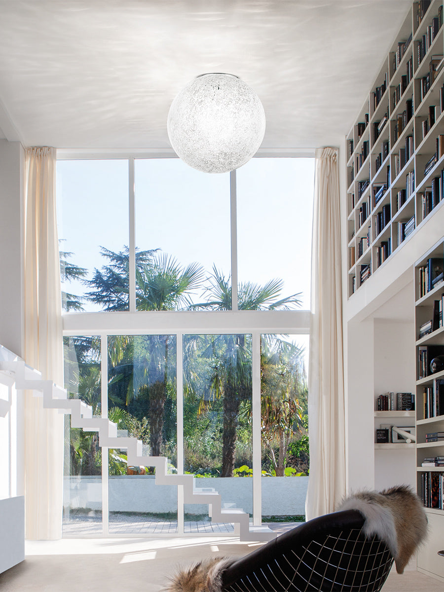 The Rina Ceiling lamp is a beautiful Murano glass fitting which is accented by white murrhines added during the blowing process, creating a mottled effect while concealing the light source. When the light is on it emits a soft speckled light around a space. Available in various size options.