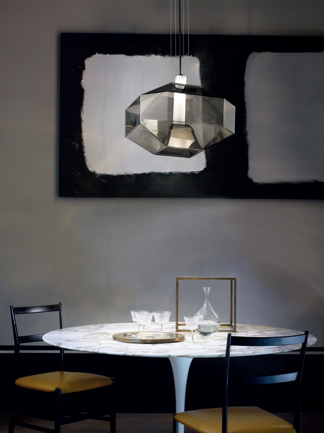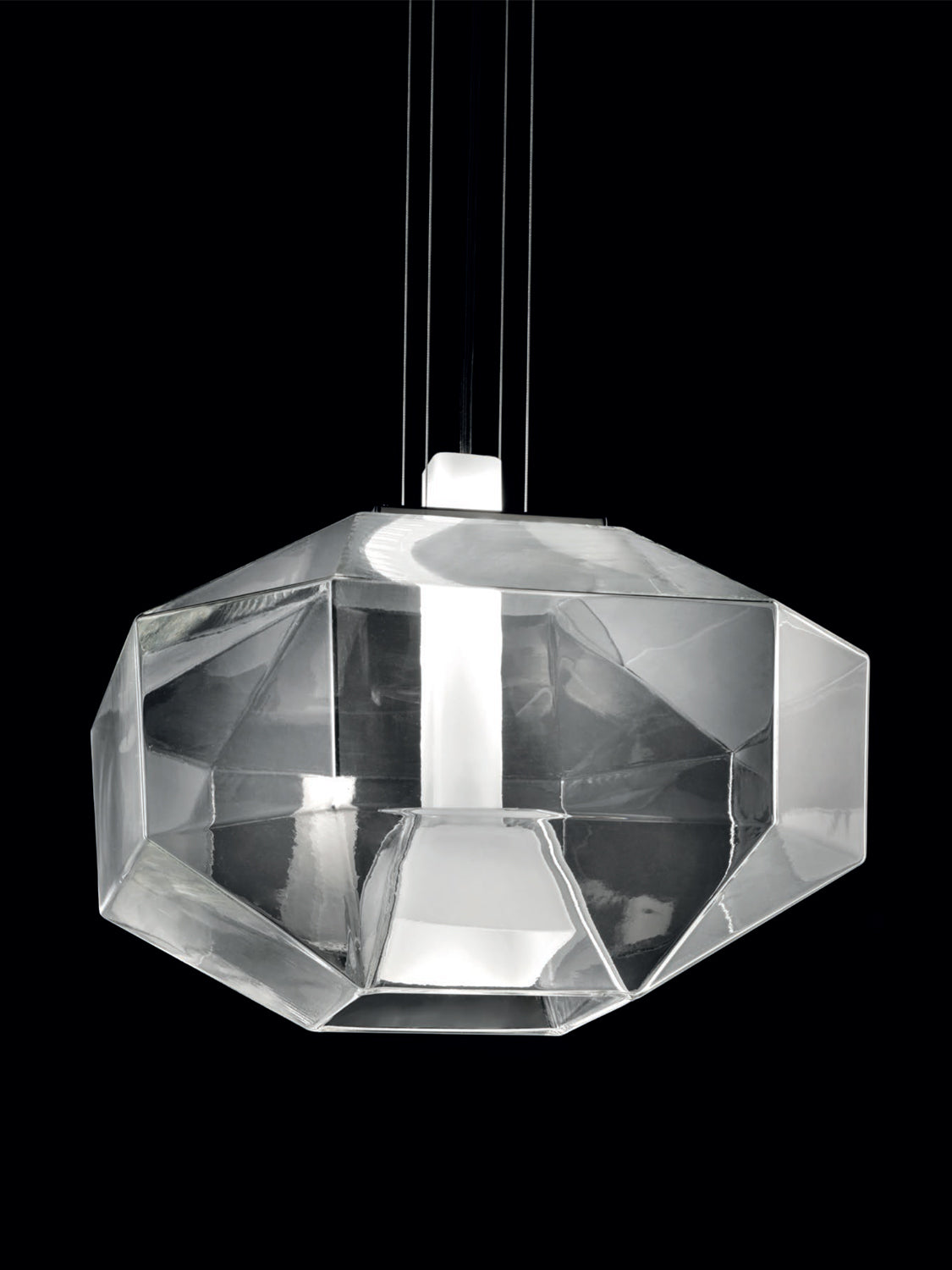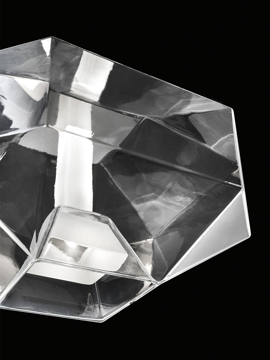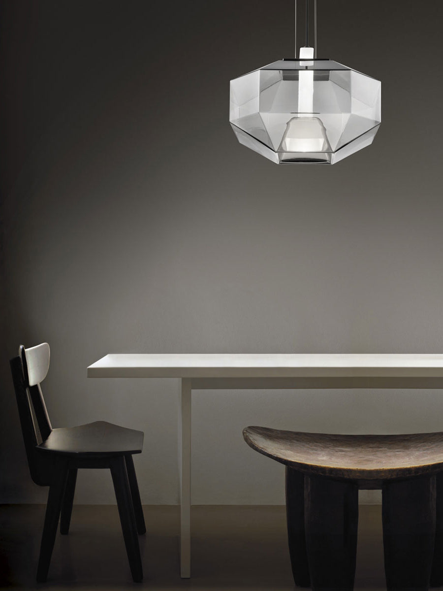 Stone is defined by almost sculptured volumes, where the lightness of mouth blown glass is opposed to the solidity of linear geometries. The pendant is comprised of two distinct pieces: a central bulb holder enclosed in opaque glass for maximum refraction of light; and a transparent diffuser, forming a single composition. The overlapping of the two glass shades produces a new color gradation that can not be achieved otherwise. Available in crystal or smoke finish. Stone was awarded a GOOD DESIGN AWARD by the Chicago Athenaeum Museum of Architecture and Design in 2017.